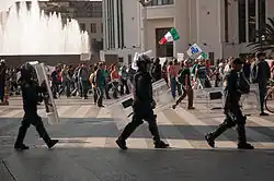 - Prevención del delito: En la mayoría de legislaciones, es el Estado quien tiene los medios necesarios para evitar la comisión de cualquier tipo de delito o falta. El principal medio del que dispone son las fuerzas policiales, que haciéndose valer de la autoridad que poseen actúan allí donde sea necesario para proteger al ciudadano de cualquier amenaza, ya sea de oficio o mediante denuncia de un particular.[26] Este tipo de actuaciones se basa en la existencia de una legislación que establezca un marco normativo en el que el Estado puede limitar las acciones del ciudadano, y que establezca el límite de estas acciones para proteger al propio ciudadano de los abusos del sistema.[27] Por ejemplo, el Estado puede efectuar detenciones o interponer multas coercitivas o sanciones siempre que respete los derechos del ciudadano como el habeas corpus o su integridad física y emocional.