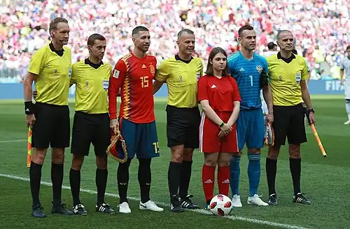 La selección española ha disputado dieciséis ediciones del Mundial y fue la anfitriona en 1982. En 2010, cosechó el mayor éxito de su historia al proclamarse campeona del mundo tras ganar en la final por 0-1 en la prórroga a Países Bajos con gol de Andrés Iniesta, convirtiéndose así en la octava selección nacional en conseguirlo y en la primera de Europa en lograrlo fuera de su continente.[4]​ Se sitúa actualmente en la séptima plaza en la clasificación histórica de la competición y también es la séptima en el palmarés, igualada con la selección inglesa. Los reconocimientos más destacados por la conquista mundialista fueron el «Premio Príncipe de Asturias de los Deportes»[5]​ y el «Premio Laureus al Mejor Equipo Internacional» del año.[6]​ Además, fue nombrada en 2013, por sexta vez consecutiva, el «Mejor Equipo» del año por la FIFA.