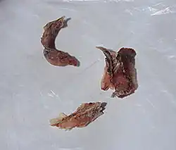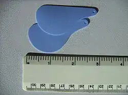 ![]() Férulas flexibles típicas que se pueden usar en septoplastia. Se mantienen en su lugar en la nariz con una puntada a través del orificio, y generalmente se retiran de siete a 10 días después de la cirugía. | ||