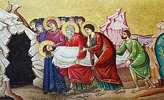 Muy importante es el papel de las Santas Mujeres o Tres Marías, a las que también se denomina miróforas ("portadoras de la mirra"),[33] tanto en el entierro como en la resurrección (pues son las que descubren la tumba vacía).[34]
