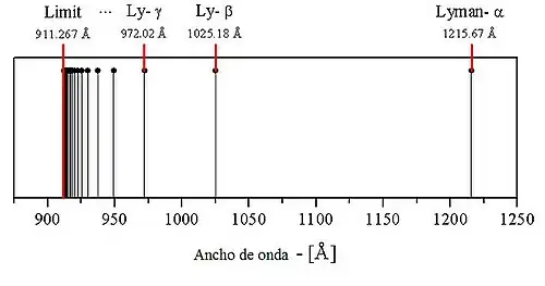 | Longitud de onda(nm) | 121.6 | 102.5 | 97.2 | 94.9 | 93.7 | 93.0 | 92.6 | 92.3 | 92.1 | 91.9 | 91.15 |