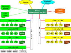 Los servicios de red son configurados en redes locales corporativas para mantener la seguridad y la operación amigable de los recursos. También estos servicios ayudan a la red local a funcionar sin problemas y eficientemente. Las redes locales corporativas usan servicios de red como DNS (Domain Name System) para dar nombres a las direcciones IP y MAC (las personas recuerdan más fácilmente nombres como"nm.ln" que números como "210.121.67.18"), y DHCP para asegurar que todos en la red tienen una dirección IP válida.