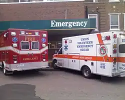 El primer servicio de ambulancias hospitalario conocido funcionó en el Commercial Hospital de Cincinnati, Ohio (actual Cincinnati General), en 1865,[15][17] y pronto le siguieron otros servicios, en particular el de Nueva York, prestado desde el Bellevue Hospital, que comenzó en 1869 con ambulancias que transportaban material médico,[18] como férulas, un lavado de estómago, morfina y brandy, reflejo de la medicina contemporánea.