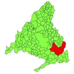 El Campo, Ambite, Arganda, Carabaña, Loeches, Olmeda, Orusco, Perales, Pezuela, Tielmes, El Villar, Valdilecha, y otras siete despobladas.[6]