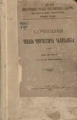 - ↑ a b c I. Strelkova, Жизнь замечательных людей: Валиханов. Moscú: Molodaya gvardia, 1983.