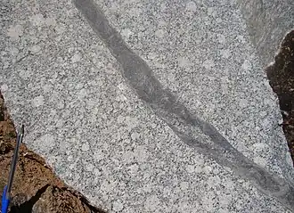 La roca es holocristalina, generalmente equigranular , en igual sentido, y gruesas con tamaño de grano de 2 mm a 5 mm. En algunos casos raros, la roca contiene feldespato alcalino fenocristales de 2 cm a 5 cm de largo y 5 mm a 2 cm de grosor. Los fenocristales demuestran la orientación y, finalmente, muestran la textura acumulativo.