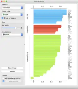 Silhouette se refiere a un método de interpretación y validación de la coherencia dentro del análisis de grupos. La técnica proporciona una representación gráfica sucinta de lo bien que se ha clasificado cada objeto.[1]