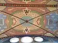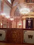 “Impresiona la monumentalidad de la bimah (una especie de púlpito), sin duda la más elaborada de las existentes en México, colocada al centro a la usanza ashkenazí. Es de madera ricamente trabajada con vidrios tallados que describen instrumentos musicales: tamboril, arpa, cítara y laúd, así como símbolos recurrentes del judaísmo: el talit (chal de uso religioso), la hoja de palma, la cidra y la estrella de David entre rezos sagrados”, añade el texto.
