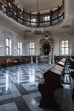 La sala, presidida por la galería del balcón de madera, está iluminada por grandes ventanales y dos candelabros de hierro forjado. El tabernáculo (Aron-Ha-Kodesh/ Armario Sagrado) de estilo barroco, con cuatro columnas retorcidas de mármol negro, está rodeado por una fina balaustrada de hierro forjado del siglo XVIII y dorada. En el lado alto de la habitación está la bimah, el púlpito elevado de madera. Un atril, cuatro grandes candelabros y bancos plegables completan el mobiliario del templo, que es de rito asquenazí.