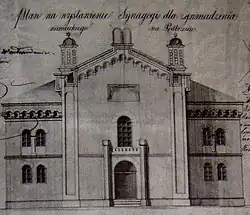 El edificio, todo un ejemplo de la arquitectura neomorisca en el centro de Europa, fue diseñado por Ignacy Hercok y construido entre 1860-1862 en la principal calle Miodowa, basándose grosso modo en los motivos arquitectónicos del Leopoldstädter Tempel en Viena. Consta de un espacio central de techo alto flanqueo por alas de menor altura.[4]