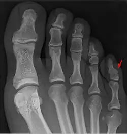 ![]() Una radiografia de un pie con sinfalangismo pedal (afectando al dedo meñique del pie), el tipo de sinfalangismo más común | ||