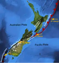 - ↑ «Huge fault rupture stretches 34km offshore from Kaikoura». Stuff.co.nz: Stuff.co.nz. 23 de noviembre de 2016. Consultado el 24 de noviembre de 2016.