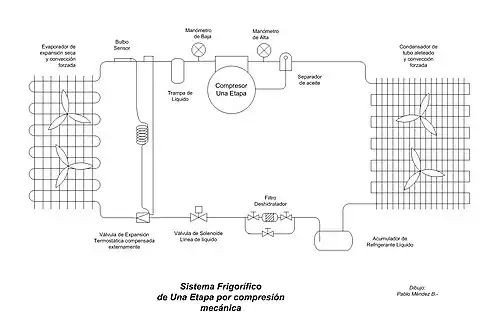 El sistema de compresión de una etapa es aquel en el cual la compresión mecánica de gas refrigerante se realiza directamente desde la presión a la salida del evaporador hasta la presión de condensación del refrigerante.[1] Para dicho cometido se utiliza un también llamado compresor de una etapa.
