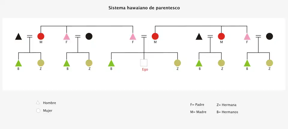 En los sistemas hawaianos, los parientes son distinguidos por sexo y generación. Hay una generación de padres y una generación de hijos. De esta suerte, Ego[1] se refiere a todas las mujeres de la generación de sus padres con el mismo término que designa a su madre, y a todos los hombres de esa generación con la misma palabra con que designa a su padre. En la generación propia, Ego llama "hermano" a todos los varones y "hermana" a todas las mujeres. El tipo hawaiano de parentesco se encuentra asociado con frecuencia a las sociedades que definen la filiación por la vía ambilineal.