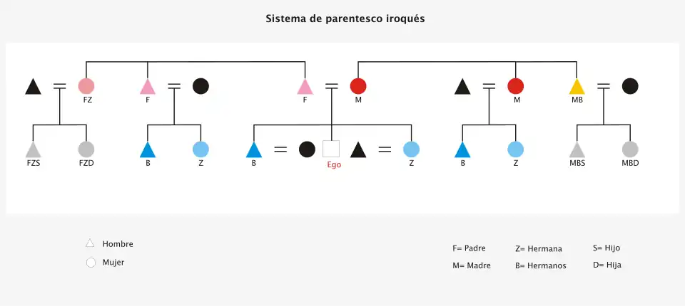 Además del sexo y la generación, los sistemas iroqueses de parentesco distinguen a los hermanos de sus padres por sexo. Los siblings[1] del mismo sexo son considerados parientes de Ego.[2] Sin embargo, los hermanos de los padres de sexo diferente son señalados con términos distintos. Por ejemplo: la hermana de la madre es designada con el mismo término que la madre, y el hermano del padre es designado con el mismo término que el padre. De aquí que los hijos de estos —primos paralelos— sean llamados con el mismo término. En contraste, el hermano de la madre es designado con el mismo término que el esposo de la hermana de la madre, y la hermana del padre, con el mismo término que se designa a la esposa del hermano del padre. Los hijos de estos parientes —primos cruzados— son nombrados por Ego con un término distinto que el que emplearía para referirse a sus primos paralelos.
