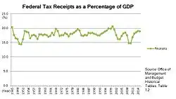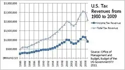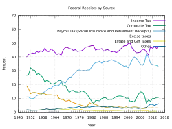 Estados Unidos es uno de los dos países del mundo que grava a sus ciudadanos no residentes sobre la renta global, de la misma manera y con los mismos tipos que a los residentes. El Tribunal Supremo de EE.UU. confirmó la constitucionalidad de la imposición de dicho impuesto en el caso Cook contra Tait.[6] No obstante, la exclusión de las rentas del trabajo en el extranjero elimina los impuestos estadounidenses sobre los primeros 120.000 dólares anuales de las rentas del trabajo de fuente extranjera de los ciudadanos estadounidenses y de determinados residentes en EE. UU. que viven y trabajan en el extranjero. (Esta es la cantidad ajustada a la inflación para 2023.)[7] Los impuestos sobre la nómina son impuestos por el gobierno federal y todos los gobiernos estatales. Incluyen los impuestos de la Seguridad Social y Medicare que gravan tanto a empresarios como a trabajadores, a un tipo combinado del 15,3% (13,3% para 2011 y 2012). El impuesto de la Seguridad Social solo se aplica a los primeros 132.900 $ de salarios en 2019.[8] Hay un impuesto adicional de Medicare del 0,9% sobre los salarios superiores a 200.000 $. Los empleadores deben retener impuestos sobre la renta sobre los salarios. A los empleadores se les aplica un impuesto de desempleo y algunos otros gravámenes. Los impuestos sobre la nómina han aumentado drásticamente como porcentaje de los ingresos federales desde la década de 1950, mientras que los impuestos de sociedades han disminuido como porcentaje de los ingresos. (Los beneficios empresariales no han disminuido en porcentaje del PIB).
