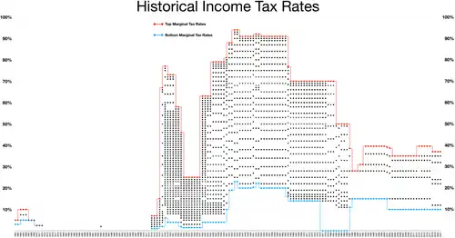 Las personas físicas están sujetas a tipos impositivos federales escalonados del 10% al 37%.[20] Las sociedades están sujetas a un tipo impositivo federal del 21%. Antes de 2018, fecha de entrada en vigor de la Ley de Empleos y Reducción de Impuestos de 2017, las sociedades estaban sujetas a tipos impositivos federales escalonados del 15 % al 35 %; se aplicaba un tipo del 34 % a los ingresos de entre 335.000 y 15.000.000 de dólares.[21] Los tipos del impuesto sobre la renta estatal, en los estados que tienen un impuesto sobre las rentas de las personas físicas, varían del 1 % al 16 %, incluido el impuesto sobre la renta local en su caso. Nueve estados no tienen impuesto sobre la renta de las personas físicas. Entre ellos se encuentran Alaska, Florida, Nevada, Dakota del Sur, Texas, Washington y Wyoming.