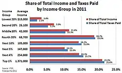 Las políticas fiscales y de transferencias de EE. UU. son progresivas y, por tanto, reducen la desigualdad efectiva de ingresos, ya que los tipos impositivos suelen aumentar a medida que aumenta la renta imponible. Como grupo, los trabajadores con ingresos más bajos, especialmente los que tienen personas a su cargo, no pagan impuestos sobre la renta y, de hecho, pueden recibir una pequeña subvención del gobierno federal (procedente de créditos por hijos y del Crédito por Ingreso del Trabajo.[2] Los impuestos recaen mucho más sobre las rentas del trabajo que sobre las del capital. Los impuestos y subvenciones divergentes para diferentes formas de ingresos y gastos también pueden constituir una forma de imposición indirecta de unas actividades sobre otras. El gobierno federal, la mayoría de los gobiernos estatales y algunos gobiernos locales gravan la renta neta de las personas físicas y jurídicas. A los ciudadanos y residentes se les grava la renta global y se les permite un crédito por impuestos extranjeros. Los ingresos sujetos a impuestos se determinan con arreglo a las normas de contabilidad fiscal, no a los principios de contabilidad financiera, e incluyen casi todos los ingresos de cualquier fuente, salvo que, como resultado de la promulgación de la Ley de Reducción de la Inflación de 2022, las grandes empresas están sujetas a un impuesto mínimo del 15% cuyo punto de partida son los ingresos anuales de los estados financieros.