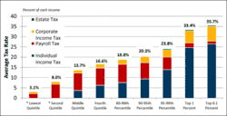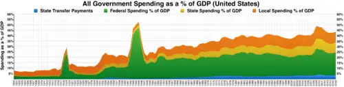 Los Estados Unidos tiene gobiernos federales, estatales y locales separados, con impuestos en cada uno de estos niveles. Los impuestos gravan la renta, las nóminas, la propiedad, las ventas, las plusvalías, los dividendos, las importaciones, las sucesiones y las donaciones, así como diversas tasas. En 2020, los impuestos recaudados por las administraciones federal, estatal y local ascendieron al 25,5% del PIB, por debajo de la media de la OCDE del 33,5% del PIB.[1]