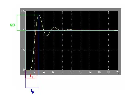 - Es el instante de tiempo en el que se produce la primera sobreoscilación en nuestro dibujo se ve representado mediante líneas azules y se denomina tp.