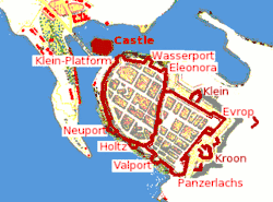 Separada de estas fortificaciones, en la pequeña isla al noroeste de la ciudad, la isla del Castillo o isla Zámkovy (en ruso Замковый, de zámok o castillo), estaba el Castillo de Víborg que disponía de 151 bocas de artillería.[4]