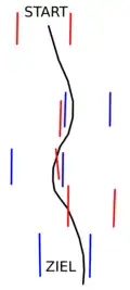 Un recorrido se construye colocando una serie de puertas, formadas por pares alternos de varas rojas y azules. El esquiador debe pasar entre las dos varas que forman la puerta, con las puntas de ambos esquís y los pies del esquiador pasando entre las varas. Un recorrido tiene de 55 a 75 puertas para hombres y de 40 a 60 para mujeres. El desnivel vertical para un campo de hombres es de 180 a 220 m y un poco menos para las mujeres.[6] Las puertas están dispuestas en una variedad de configuraciones para desafiar al competidor.