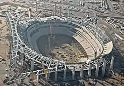 La ceremonia de apertura de construcción se llevó a cabo el día 17 de noviembre del 2016. El estadio fue diseñado por HKS y se preveía un coste de US$ 2660 millones de dólares,[24][25] no obstante en el desarrollo de la edificación el costo se elevó a cinco mil millones, convirtiéndose en el recinto deportivo más caro del mundo.[26] El inmueble estaba programado para inaugurarse en 2019, sin embargo las lluvias torrenciales en el estado de California durante el invierno de 2017 ocasionarían el retraso de hasta un año en las obras; esto provocó el cambio de sede del Super Bowl LV de 2021, otorgado un año antes, hacia el Raymond James Stadium en Tampa, Florida, no obstante se le concedió el Super Bowl LVI de 2022.[27][28][29]