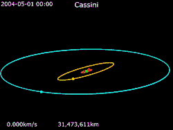 Una animación de la trayectoria de la nave espacial Cassini alrededor de Saturno a lo largo de 10 años, durante los cuales pasó de cerca por muchas lunas de Saturno, está a la derecha.