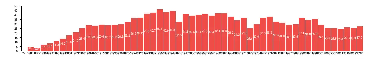 | Elección | Votos | Escaños | ||