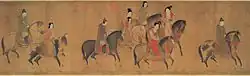 Al igual que sus habilidades intelectuales, la gente exhibió hábitos y pasatiempos culturales que marcaron su estatus sociales y refinamiento. El término erudito 'nueve invitados' (jiuke)—una extensión de las Cuatro Artes de la Academia China—fue una metáfora para los pasatiempos de la gente como la cítara china, el ajedrez chino, meditación budista zen, tinta (caligrafía y pintura), casas de té, alquimia, canto poético, conversaciones, y salas de vino.[54] La producción pictórica de la alta burguesía cambió radicalmente de estilo entre el periodo Norte y el Sur durante la dinastía Song, debido a las circunstancias políticas, demográficas y sociales subyacentes. La alta burguesía y los funcionarios del Song del Norte, que estuvieron en gran medida interesados en abordar asuntos de interés nacional y no tanto en temas locales, prefirieron pintar escenas paisajísticas enormes donde las personas aparecían totalmente reducidas.[55] Durante el periodo Sur, los intereses políticos, familiares y sociales se vieron muy influidos por asuntos más locales; estos cambios se vieron reflejados en el principal estilo pictórico del periodo Sur, en el que las escenas pequeñas e íntimas situaron su foco principal sobre las personas.[55]