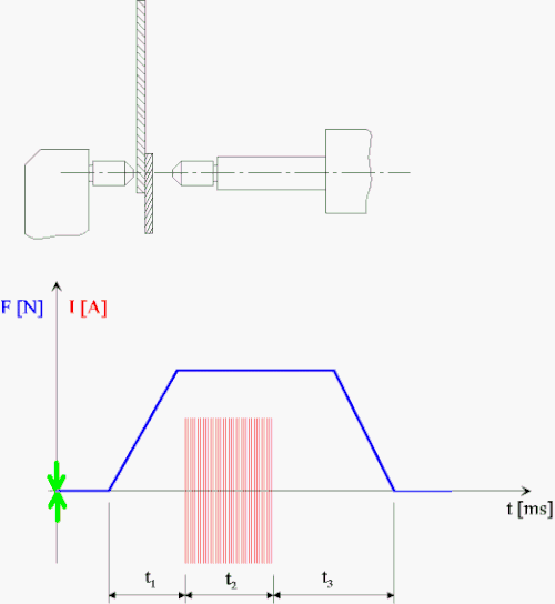 - TIEMPO DE MANTENIMIENTO (de forja):Después de cortarse la corriente eléctrica, se mantiene una presión entre los electrodos durante esta fase (de forja: se incrementa la presión ejercida después de cortarse la corriente eléctrica).