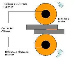 Un transformador suministra la energía para la unión en forma de bajo voltaje y alta potencia de corriente alterna. El conjunto formado por la pieza de trabajo o roldana tiene una resistencia eléctrica muy elevada con respecto al resto del circuito y se calienta hasta su punto de fusión debido a la corriente aplicada. Las superficies semi-fundidas se presionan entre sí debida a la presión de soldadura y se crea un vínculo de fusión que da lugar a una estructura uniforme de soldado. La mayoría de aparatos de soldadura por roldanas utilizan agua como refrigerante para los electrodos, roldanas y ensambles debido al elevado calor que se genera. En este proceso de soldadura se obtiene una soldadura de alta duración ya que la soldadura se forma por el calor y la presión ejercida. Los elementos soldados son generalmente más resistentes que el material del que están formados.