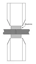 En este proceso de soldadura por roldanas se coloca aluminio a cada lado de los bordes para la soldadura a tope de las chapas que se quieren unir. Normalmente se utilizan 4 mm de aluminio para conservar la resistencia a la corrosión en el acero revestido. Es un proceso en el que prácticamente no se producen grietas y con él se producen soldadura de láminas de gran anchura.