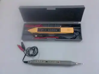 En la rama Automotriz se utiliza una variante de este instrumento,calibrado para realizar lecturas alrededor de los 12 o 24 voltios,en Latinoamérica y países hispanos se le denomina indiferentemente como sonda o punta lógica,pero no debe confundirse con la anterior,ya que este último instrumento simplemente reemplaza a las antiguas lámparas de prueba,aunque algunos modelos indican efectivamente polaridad,esto se mide en circuitos de altos voltajes,diferentes a los estándares existentes en electrónica digital.
