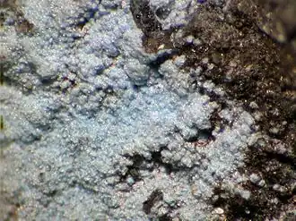 El mineral de la foto proviene de la mina de Jezkazgan, provincia de Karagandá, Kazajistán Horizonte de visión: 5 mm. El espécimen es una Spertiniita azul blanquecina.