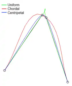 en el que va de 0 a 1 para la parametrización de los nodos, y con . Para el spline centrípeto de Catmull-Rom, el valor de es . Cuando , la curva resultante es el spline uniforme de Catmull-Rom estándar; y cuando , el resultado es el spline cordal de Catmull-Rom.