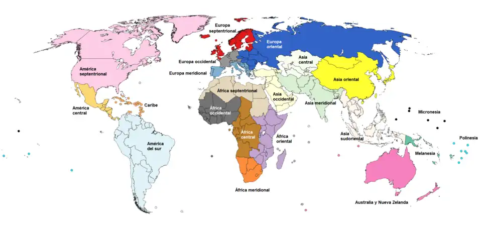 Sin embargo este esquema es usado por muchos otros cuerpos de la ONU, junto a otros esquemas.[3][4][5][6] Según la ONU estas divisiones geográficas no implican necesariamente ninguna afiliación política entre países o territorios hecha por la organización.