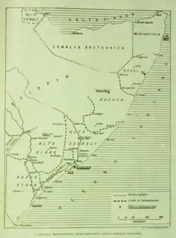 A finales del siglo XIX, todos los monarcas somalíes existentes celebraron tratados con una de las potencias coloniales, Abisinia, Gran Bretaña o Italia, excepto Reer-Darwiish,[5] ya que los italianos consideraban parte de Reer-Darwiish súbdito del sultán de Dhulbahante, protegido por Italia. el Majerteen.[6] Con la intermediación del sultán Yusuf Ali Kenadid y después de una conferencia de todos los notables del sultanato en Bargal,[7] en 7. En abril de 1889, en ʿAlūla, Somalia, Boqor Osman firmó un tratado con Italia, convirtiendo su reino en un protectorado conocido como Somalilandia italiana.[8] Sin embargo, en los años posteriores al tratado, el protectorado fue más bien nominal debido a que los buques de guerra italianos encargados de mantener el contacto con el sultán lo visitaban de manera tan rara e irregular. La piratería, el saqueo de barcos de vapor estrellados, el comercio de armas y de esclavos podrían llevarse a cabo casi sin consecuencias.[8]