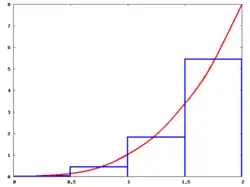 se aproxima aquí por el valor en el punto final derecho. Esto da múltiples rectángulos con base y altura . Haciendo esto para y sumando las áreas resultantes se produce