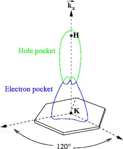 Los materiales que presentan estructuras cristalinas complejas pueden tener superficies de Fermi bastante intrincadas. La figura muestra la superficie de Fermi anisótropa del grafito, que tiene zonas tanto de electrón como de hueco en su superficie de Fermi debido a las múltiples bandas que atraviesan la energía de Fermi a través de la dirección . A menudo en un metal el radio de la superficie de Fermi es mayor que el tamaño de la primera zona de Brillouin, lo que resulta en una parte de la superficie de Fermi que se encuentra en la segunda zona (o mayores). Al igual que la propia estructura de bandas, la superficie de Fermi se puede mostrar en un esquema de zona extendida donde se permite que tenga tamaños arbitrariamente grandes, o en un esquema de zona reducida donde los vectores de onda tengan módulo (en el caso unidimensional), donde es el parámetro de red. En el caso tridimensional, el esquema de zona reducida equivale a que de cualquier vector de onda existe un número apropiado de vectores de la red recíproca tales que el nuevo es más cercano al origen en el -espacio que cualquier . Los sólidos con gran densidad de estados al nivel de Fermi se vuelven inestables a bajas temperaturas y tienden a formar estados fundamentales donde la energía de condensación proviene de abrir un hueco en la superficie de Fermi. Ejemplos de estos estados fundamentales son los superconductores, materiales ferromagnéticos, distorsiones Jahn-Teller y ondas de densidad de espín.