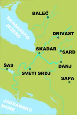 - ↑ John V. A. Fine; John Van Antwerp Fine (1994). The Late Medieval Balkans: A Critical Survey from the Late Twelfth Century to the Ottoman Conquest. University of Michigan Press. p. 420. ISBN 978-0-472-08260-5. Consultado el 10 de agosto de 2013. «In short order he recovered Skadar, Drivast, and Sveti Srđ from the small Turkish garrisons in residence.»