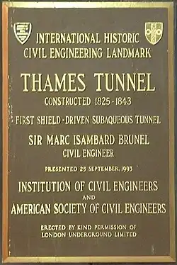 En 1991, el Túnel del Támesis fue designado como Monumento histórico internacional de la ingeniería civil por la Sociedad Estadounidense de Ingenieros Civiles y por la Institución de Ingenieros Civiles.[13]