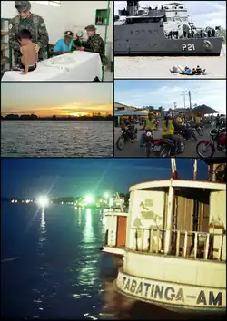 ![]() Desde la parte superior, de izquierda a derecha: Los médicos del ejército brasileño en Tabatinga; Ejército brasileño en Tabatinga; Río Amazonas desde Tabatinga; Mototaxi en la calle de Tabatinga; Puerto fluvial de Tabatinga.