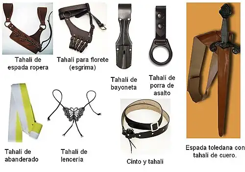 - ↑ Casares, Julio (1075). Diccionario ideológico de la lengua española. Barcelona: Gustavo Gili. p. 795. «(Se cotejan las dos definiciones: tahalí y talabarte)».