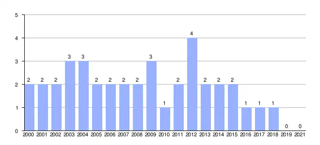 | Gráfica de evolución demográfica de Tajurmientos[3] entre 2000 y 2021 |