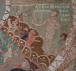 8. Adán buscando otro hombre entre los animales del Paraíso y la inscripción Adam non inveniebatur similen sibi - Adán no encontraba a nadie similar a él.