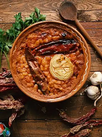 Las judías blancas empleadas son secas y es habitual que se pongan en remojo unas horas antes de su elaboración. Se trata de un cocido elaborado con judías y pimiento que en su última fase se calienta en un horno a casi doscientos grados, la complicación del plato está en que las judías no se sequen y permanezcan en una salsa viscosa. En su elaboración no participa carne. En Macedonia del Norte el plato más conocido es el Tetovo Tavče Gravče.