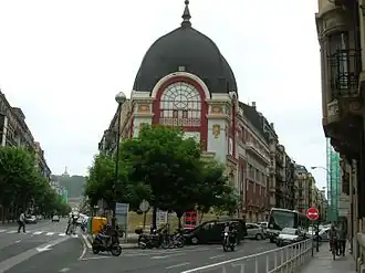 Hacia la calle Urbieta, en la planta baja, hay seis espacios, de los cuales los tres principales constituyen la entrada principal del edificio. En estos tres huecos, hay tres ojos de buey, decorados con guirnaldas. Más arriba, siguiendo los ejes centrales de los tres primeros huecos, hay grandes ventanas entre pilastras; y en los flancos hay dos ventanas entre pilastras sobre cada eje, cuya parte superior es un arco de medio punto. Los lados derecho e izquierdo no son iguales: el eje derecho tiene muestra un paño de doble tamaño que el de la izquierda. En el lado superior, en cambio, hay cinco vanos, de los cuales los tres del centro, entre pilares, siguen los ejes marcados por las puertas de entrada principales de la planta baja, y comunican con un balcón corrido con balaustrada y suelo de hormigón que hay en la fachada. En cuanto a la zona de la cúpula, en la fachada de la calle Urbieta, hay un hueco más en la planta baja, y en el primer piso hay un gran ventanal con una hermosa carpa con arcadas. Sobre ella hay una carátula y un balcón abierto con balaustrada. Sobre este eje, hay una gran ventana con un arco semicircular y sobre ella la cúpula.