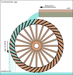 La energía del agua se aprovechaba mediante el uso de ruedas hidráulicas, que tenían dos tipos de diseños generales: aprovechando el caudal por la parte inferior o por la parte inferior. La rueda hidráulica inferior generaba energía a partir del flujo natural de un curso de agua corriente que empujaba las paletas sumergidas de la rueda. La rueda de agua de carga superior generaba energía haciendo que el agua fluyera sobre sus paletas desde arriba. Por lo general, esto se lograba construyendo un acueducto para hacer llegar el agua por encima de la rueda. Aunque es posible hacer que la rueda hidráulica superior sea un 70 por ciento más eficiente que la inferior, esta última era generalmente el modelo preferido. La razón es que el costo de construir un acueducto era demasiado alto para el leve beneficio de que la rueda hidráulica girara más rápido. Su propósito principal era generar energía para las operaciones de molienda y elevar el agua por encima de la altura natural de un sistema. También existe evidencia de que se utilizaron ruedas hidráulicas para impulsar el funcionamiento de las sierras, aunque solo quedan escasas descripciones de tales dispositivos.[3]