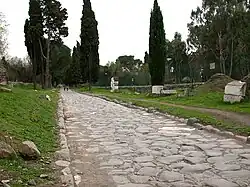 Los romanos construyeron principalmente carreteras para facilitar el desplazamiento de sus ejércitos. Su importancia económica probablemente también fue significativa, aunque el tráfico de carretas a menudo estaba prohibido en las carreteras para preservar su valor militar. En total, se construyeron más de 400 000 kilómetros (248 549,1 mi) de caminos, 80,5 kilómetros (50,0 mi) de los cuales se pavimentaron con losas de piedra.[25]